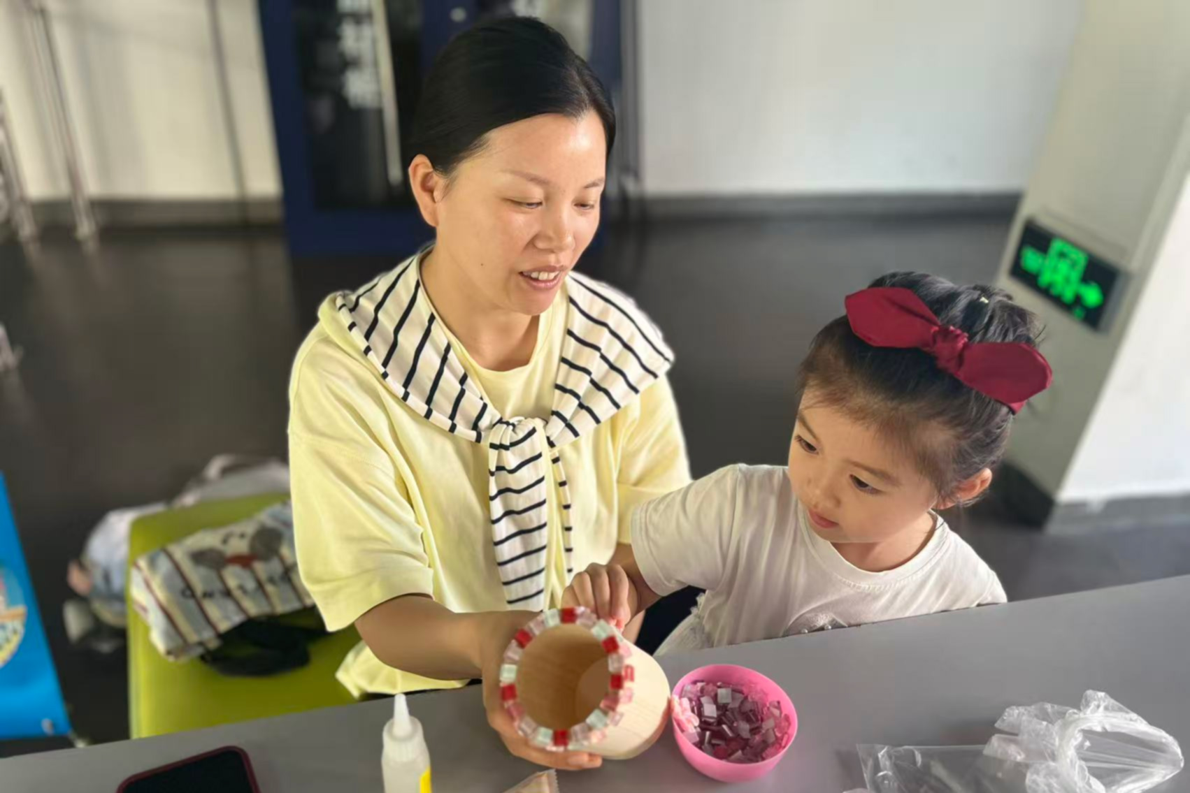 北翼商业街成功举办“亲子DIY马赛克笔筒”主题活动,10组亲子家庭共同参与,孩子们在家长的协助下将对老师的祝福融入手工作品,活动现场温馨热闹。